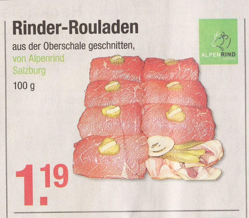 Doch wieso gibt es so wenig Versuche, Marken für gutes Fleisch in Deutschland zu etablieren? So wie Label Rouge in Frankreich oder auch bloße Rassebezeichnungen wie Angus und Wagyu? Wieso wird dieser Weg nicht gegangen, um höherwertiges Fleisch zu verkaufen, Kunden zu binden und gleichzeitig ein besseres Auskommen für die Erzeuger bei besserer Haltung der Tiere zu ermöglichen? Es ist mir schleierhaft. Von einem Versuch möchte ich nun berichten. Es ist die Marke Alpenrind Salzburg, die (vermutlich nur im Süden Deutschlands) beim V-Markt eingeführt wird. Im doppelten Sinne des Wortes. Das Logo mit der Kuh ist angenehm grün, fast bio in der Erscheinung. Alles deutet darauf hin, das könnte etwas Gutes sein: