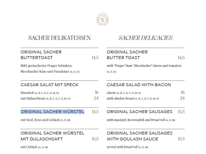 Bemerkenswert auch, dass die Idee dieser Würstel schon über 30 Jahre alt ist. Und die Sacherwürstel kann man jetzt von verschiedensten Anbietern erwerben, so auch von Wiesbauer oder Hofstädter. Es sind natürlich nicht einfach nur umgelabelte Wiener, sondern Würstchen, die in mehreren Dimensionen verfeinert wurden, wie Länge, Farbe, Textur. Der größte Unterschied zu denen im Cafe ist sprachlich das Fehlen des „Original“. Interessant dabei, dass der Name „Sacher“ nicht exklusiv von dem Hotel bzw. Cafe verwendet werden kann. Die Seite des Lieferanten der Originalwürstel finden Sie übrigens hier.